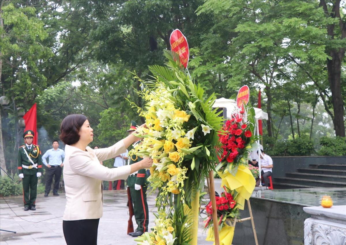 Phó Bí thư Thường trực Tỉnh ủy, Chủ tịch HĐND tỉnh Bắc Ninh Nguyễn Hương Giang dâng hoa trước tượng đài đồng chí Hoàng Quốc Việt (28/5/2025). Ảnh: Thanh Thương- TTXVN