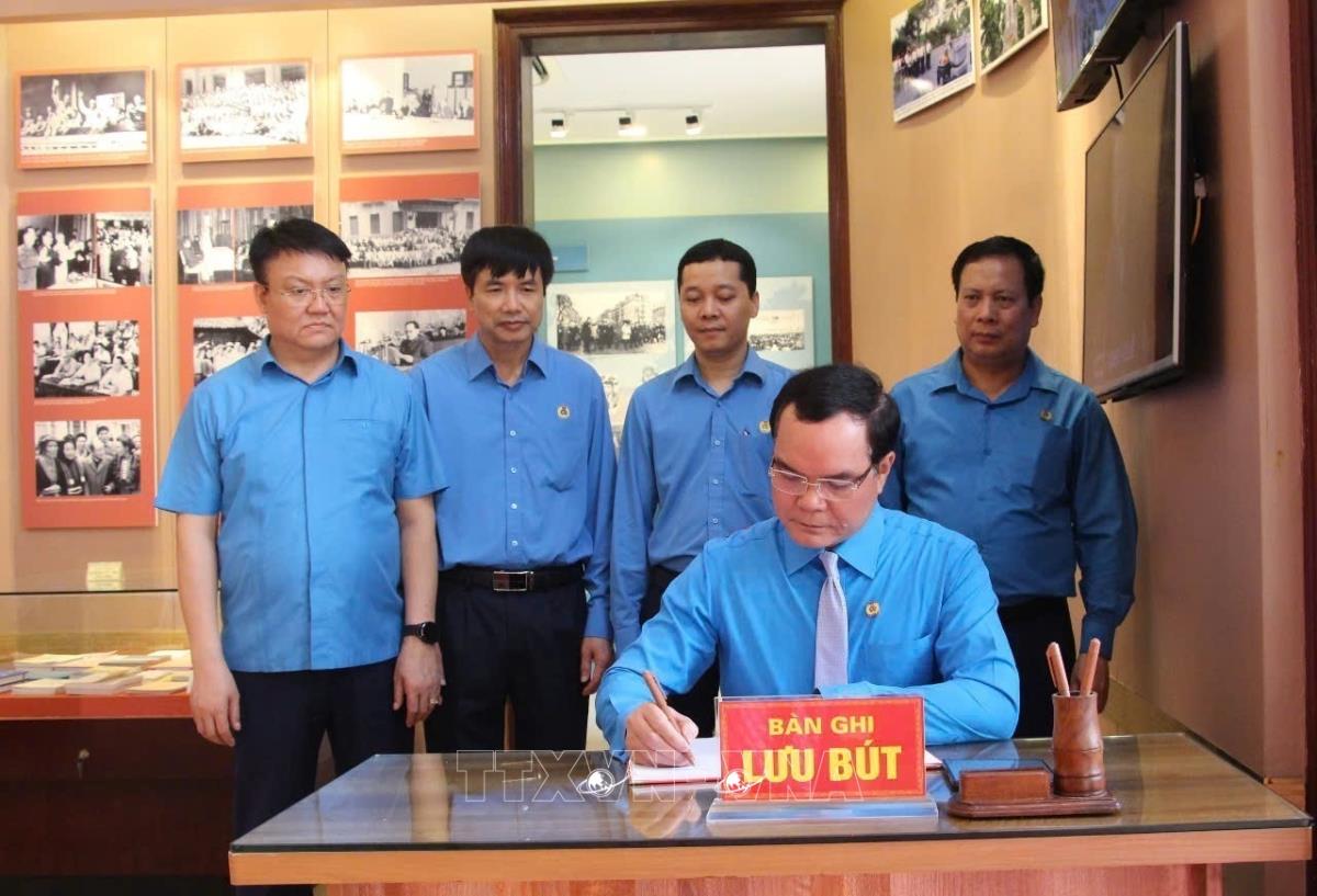 Chủ tịch Tổng Liên đoàn lao động Việt Nam Nguyễn Đình Khang viết lưu bút tại nhà lưu niệm đồng chí Hoàng Quốc Việt (28/5/2025). Ảnh: Thái Hùng- TTXVN