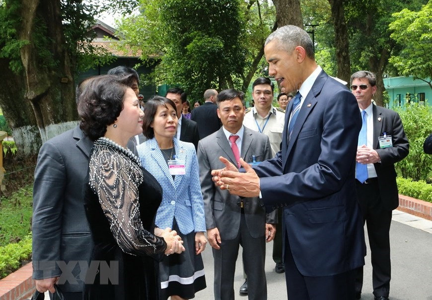 Chủ tịch Quốc hội Nguyễn Thị Kim Ngân đón Tổng thống Barack Obama tới thăm Khu di tích Chủ tịch Hồ Chí Minh trong Phủ Chủ tịch. (Ảnh: Trọng Đức/TTXVN)