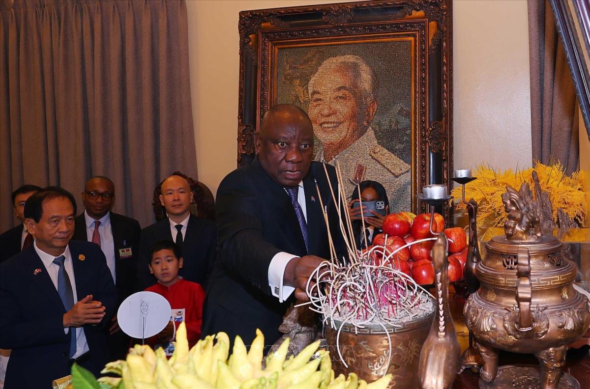 Tổng thống Nam Phi Matamela Cyril Ramaphosa dâng hương Đại tướng Võ Nguyên Giáp (24/10/2025). Ảnh: Văn Điệp – TTXVN