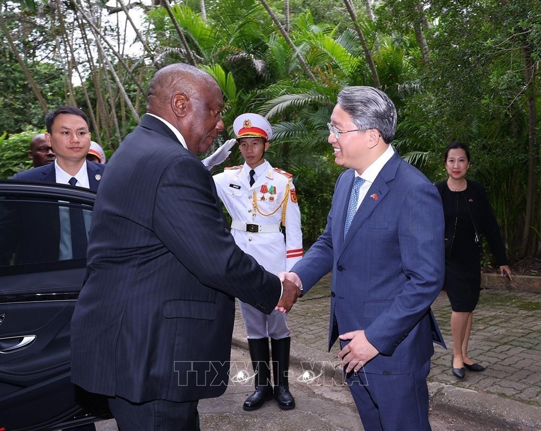 Bộ trưởng Bộ Tư pháp Nguyễn Hải Ninh đón Tổng thống Nam Phi Matamela Cyril Ramaphosa đến thăm gia đình Đại tướng Võ Nguyên Giáp (24/10/2025). Ảnh: Văn Điệp – TTXVN