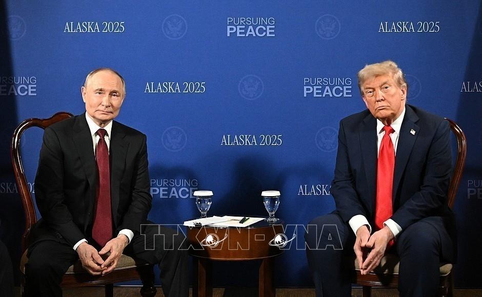 Tổng thống Nga Vladimir Putin (trái) trong cuộc họp với Tổng thống Mỹ Donald Trump tại Căn cứ Elmendorf-Richardson ở Anchorage, bang Alaska (Mỹ) ngày 15/8/2025. Ảnh: THX/TTXVN