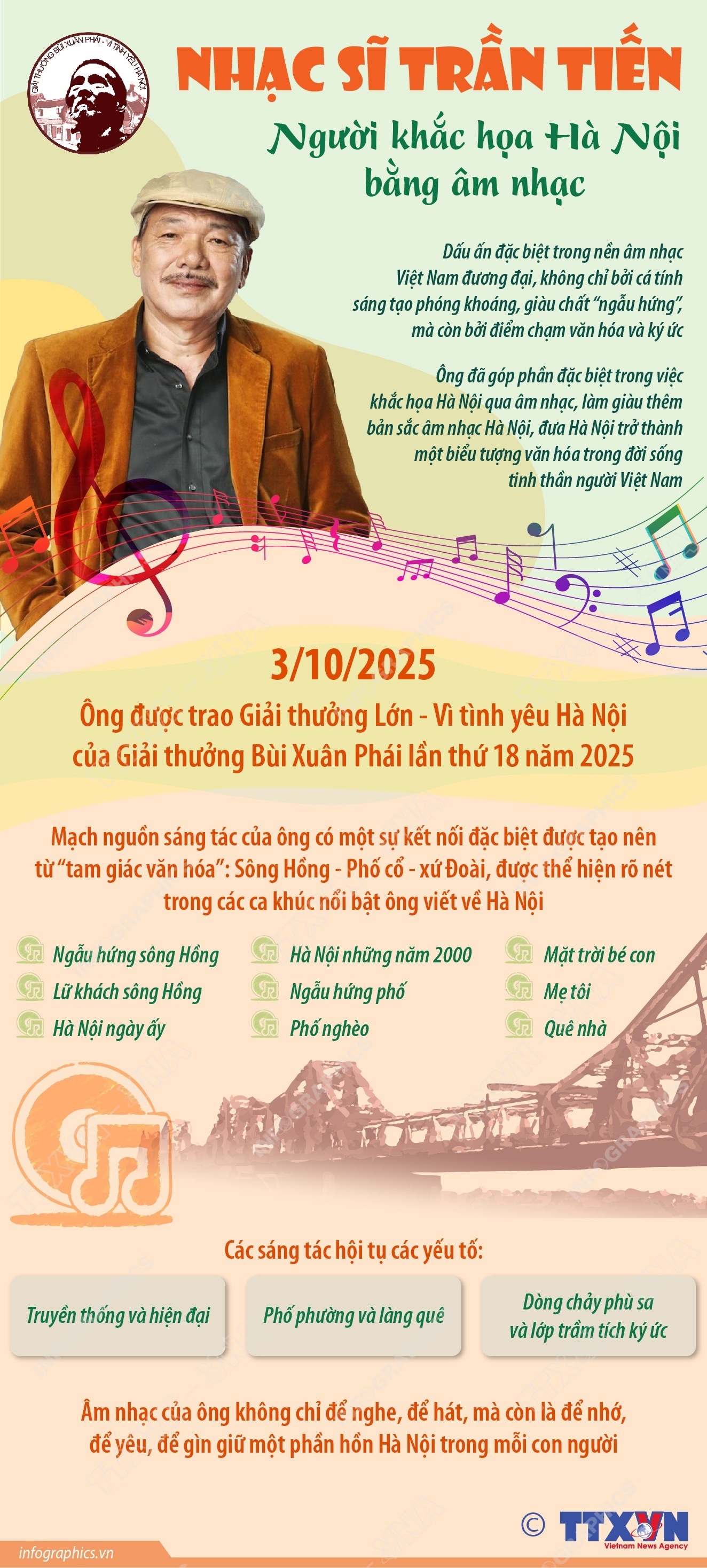 Hà Nội (TTXVN 4/10/2025) Tối 3/10/2025, “Giải thưởng Lớn - Vì tình yêu Hà Nội” - hạng mục quan trọng nhất của Giải thưởng Bùi Xuân Phái đã gọi tên nhạc sĩ Trần Tiến, tiếp nối những nhân vật gắn bó Hà Nội như Nguyễn Vinh Phúc, Tô Hoài, Phan Huy Lê, Phú Quang, Hồng Đăng…