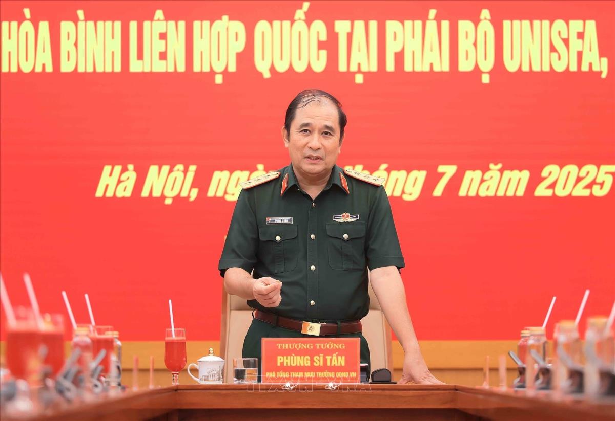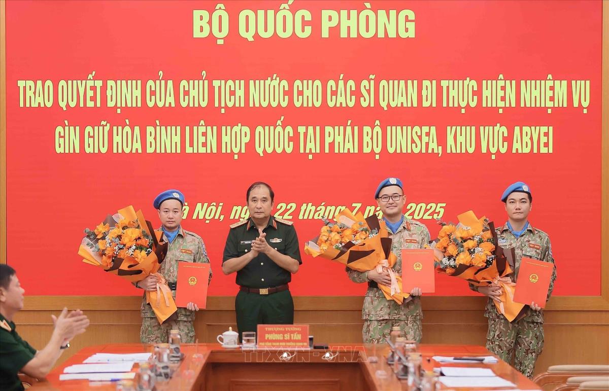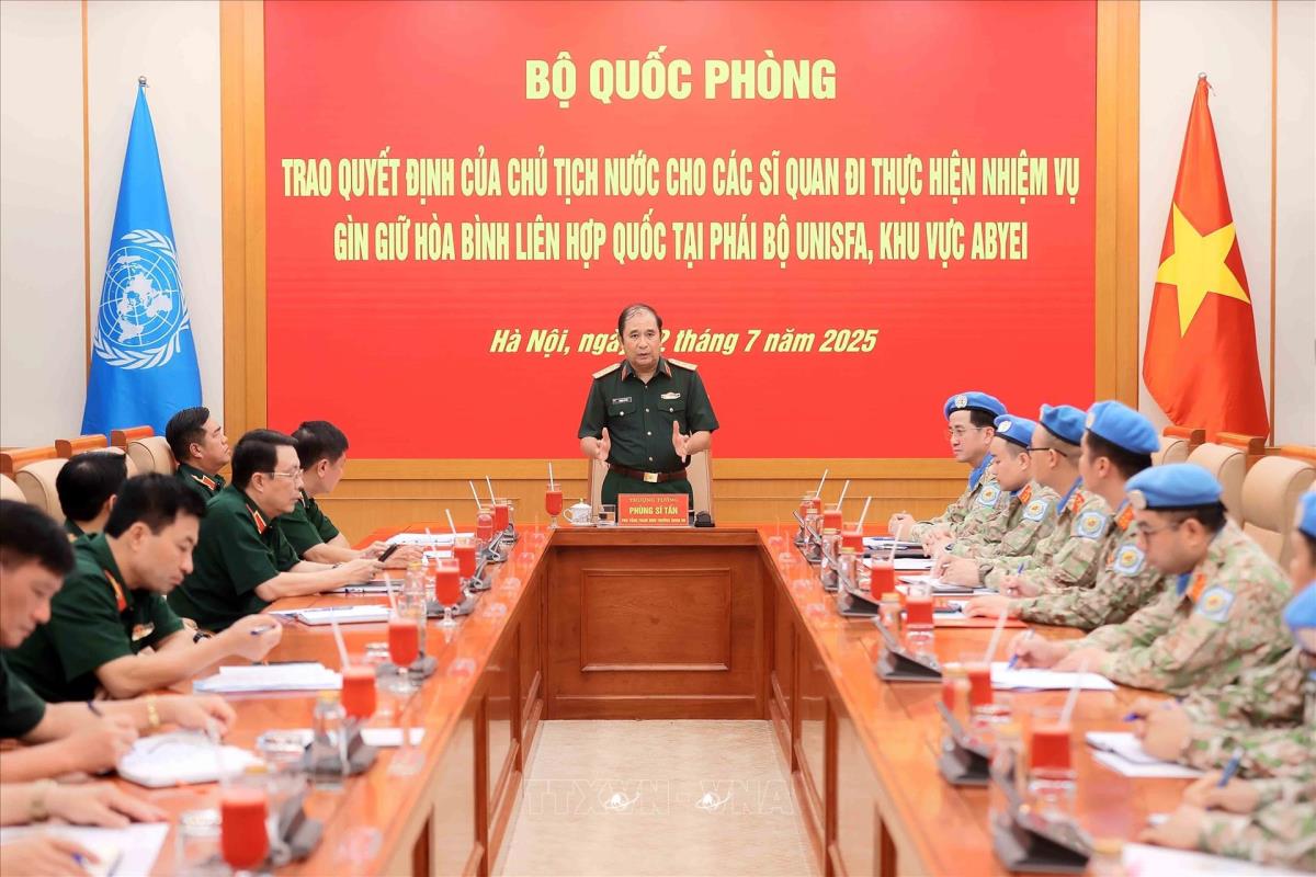 Chiều 22/7/2025, tại Hà Nội, Bộ Quốc phòng tổ chức Lễ trao Quyết định của Chủ tịch nước và Bộ trưởng Bộ Quốc phòng cho các sĩ quan đi thực hiện nhiệm vụ gìn giữ hòa bình Liên hợp quốc tại Phái bộ UNISFA, khu vực ABYEI. Thượng tướng Phùng Sĩ Tấn, Phó Tổng tham mưu trưởng Quân đội nhân dân Việt Nam, Tổ phó Tổ công tác liên ngành, Phó Trưởng Ban Chỉ đạo Bộ Quốc phòng về tham gia hoạt động Gìn giữ hòa bình Liên hợp quốc chủ trì buổi lễ.