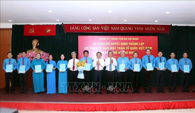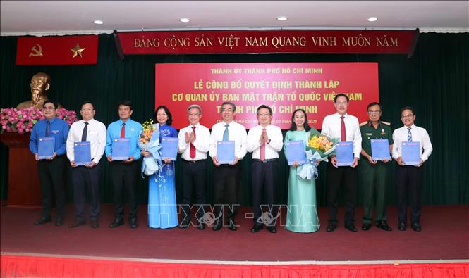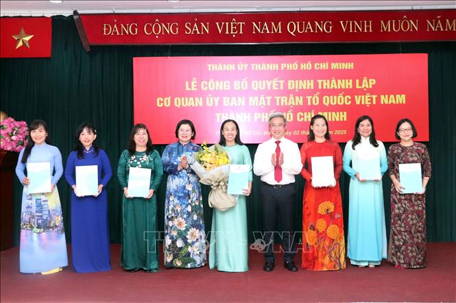 Hà Nội (TTXVN 2/7/2025) Chiều 2/7, Thành ủy Thành phố Hồ Chí Minh tổ chức lễ công bố Quyết định thành lập Cơ quan Ủy ban MTTQ Việt Nam Thành phố Hồ Chí Minh; quyết định của Trung ương về công nhận ban lãnh đạo các tổ chức chính trị - xã hội của Thành phố Hồ Chí Minh sau khi hợp nhất với tỉnh Bình Dương, tỉnh Bà Rịa-Vũng Tàu.