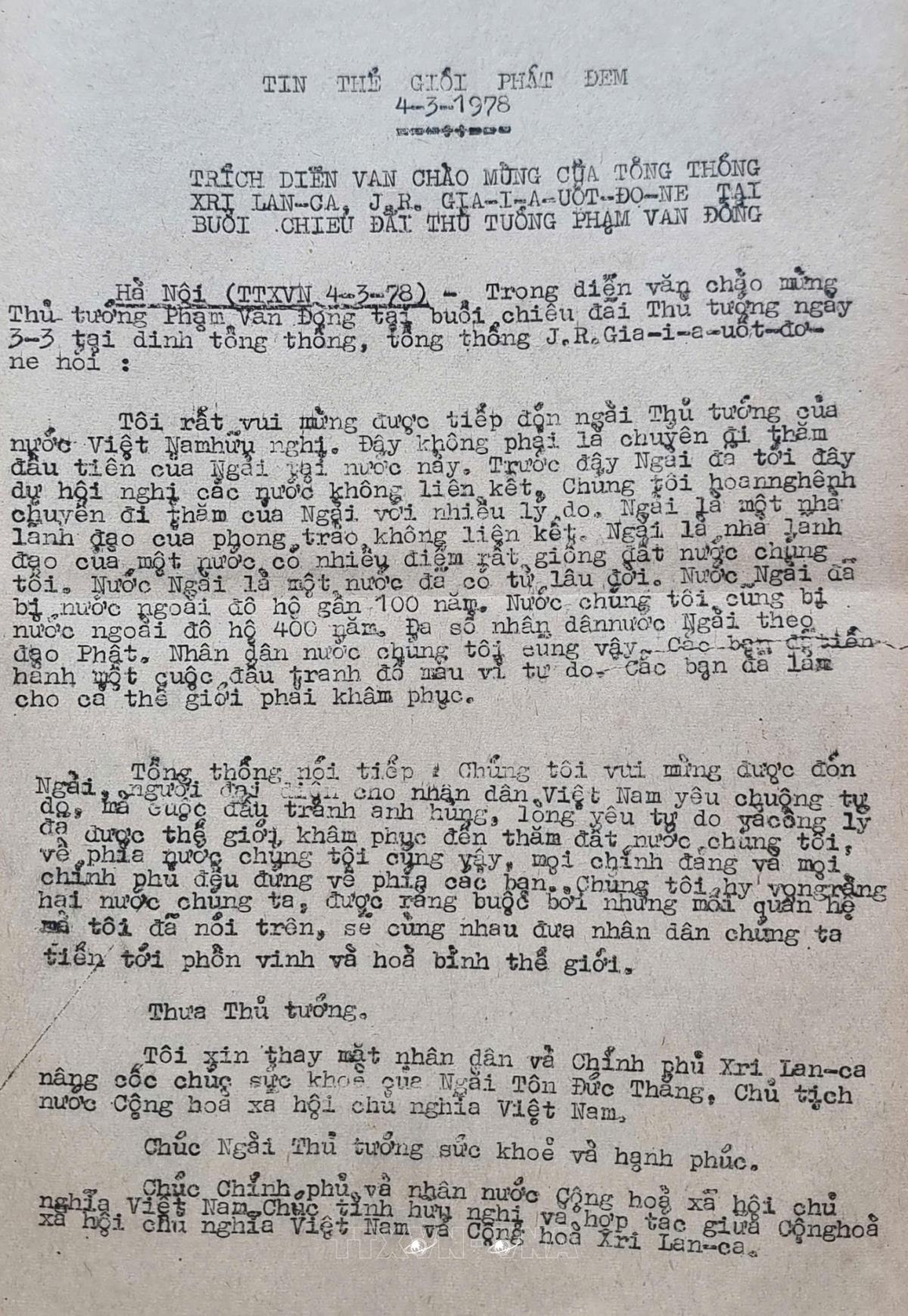 Trích diễn văn chào mừng của Tổng thống Sri Lanka tại buổi chiêu đãi Thủ tướng Phạm Văn Đồng