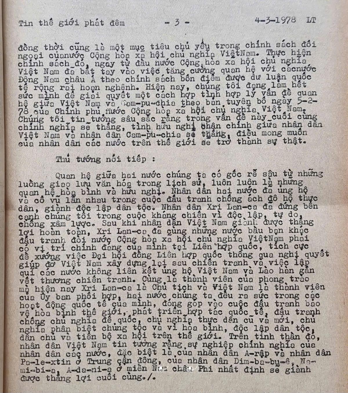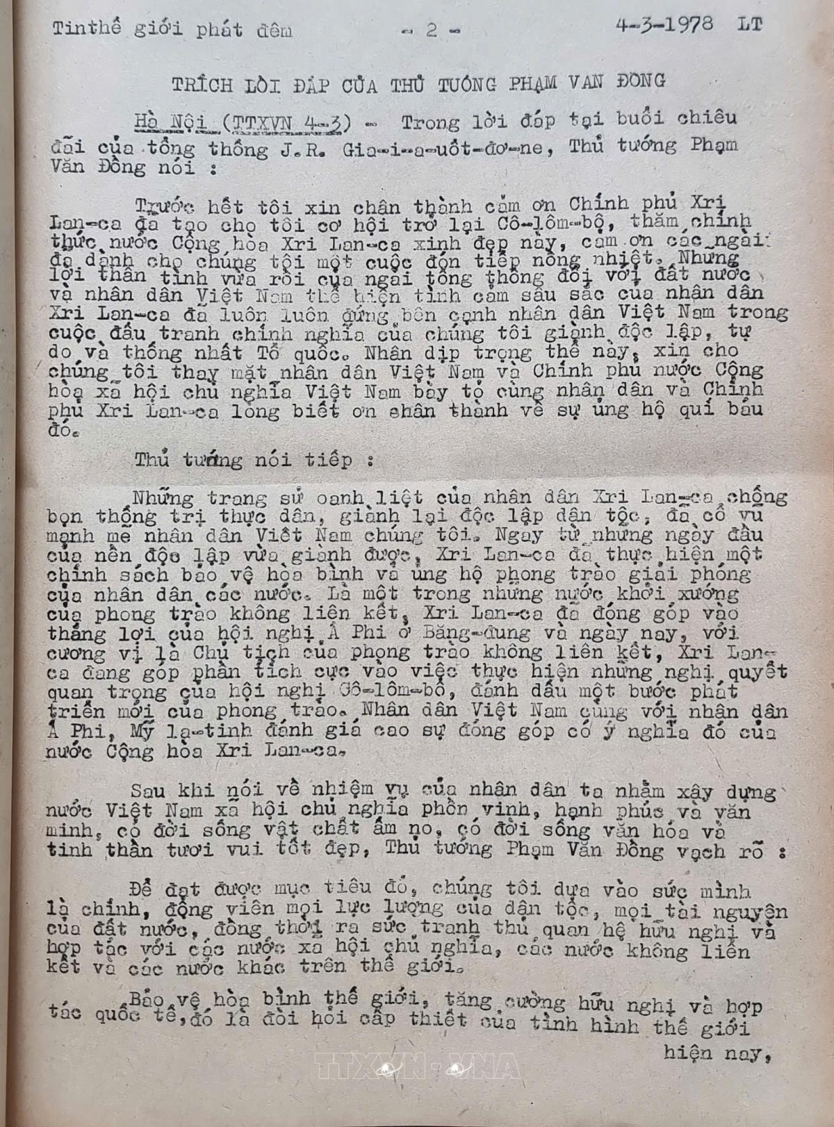 Trích lời đáp của Thủ tướng Phạm Văn Đồng Nhân vật liên quanỦy viên Bộ Chính trị khóa II, III, IV, V; Bí thư Trung ương Đảng khóa II; Thủ tướng Chính phủ (9/1955 - 7/1981); Chủ tịch Hội đồng Bộ trưởng; (7/1981 - 6/1987)Phạm Văn Đồng Tin Thế giới phát đêm của Thông tấn xã Việt Nam, ngày 4/3/1978 Từ khóa:Việt Nam-Sri LankaThủ tướng Phạm Văn Đồng