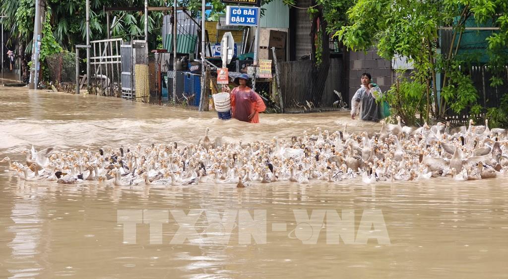 Người dân xã Suối Hiệp (Khánh Hòa) di chuyển đàn vịt chạy lũ. Ảnh: Nguyễn Thành - TTXVN