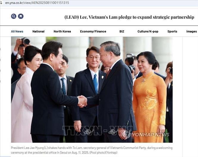 Hà Nội (TTXVN 12/8/2025) Ngày 12/8, truyền thông Hàn Quốc tiếp tục đưa tin đậm nét về các hoạt động trong chuyến thăm cấp Nhà nước của Tổng Bí thư Tô Lâm và Phu nhân Ngô Phương Ly, cùng Đoàn đại biểu cấp cao Việt Nam tới Đại Hàn Dân Quốc từ ngày 10-13/8/2025.
