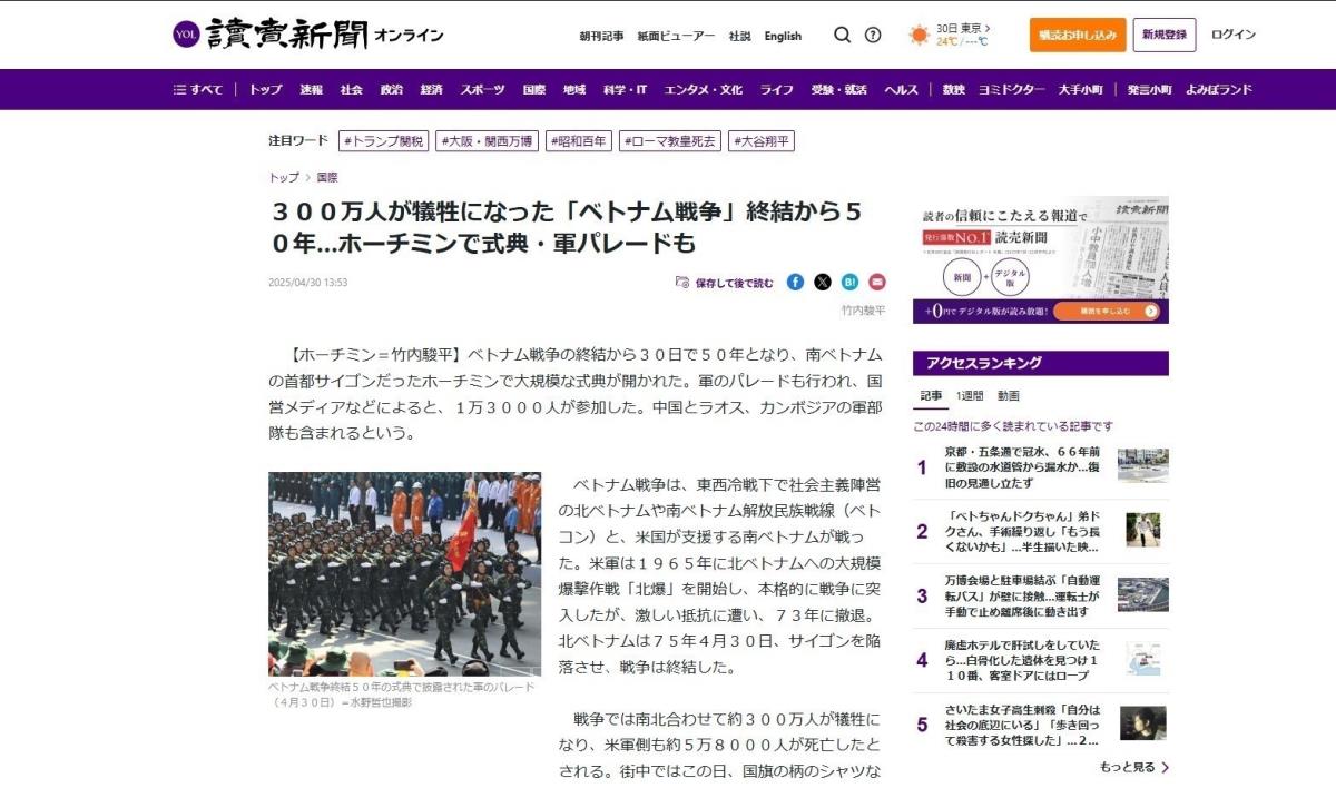 Với tiêu đề “Lễ kỷ niệm 'Vượt qua chia rẽ trong quá khứ' đánh dấu 50 năm kết thúc Chiến tranh Việt Nam, kêu gọi hòa giải”, báo Asahi nhấn định cuộc chiến chia cắt đất nước thành hai miền Nam - Bắc và để lại "những vết sẹo sâu sắc". Báo Asahi đặc biệt trích dẫn phát biểu của Tổng Bí thư Tô Lâm nêu bật thông điệp "khép lại quá khứ, tôn trọng khác biệt, hướng tới tương lai", và kêu gọi sự đoàn kết vượt qua ký ức về chiến tranh.
