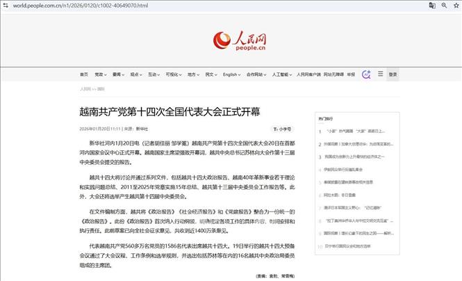 Hà Nội (TTXVN 20/1/2026) Ngày khai mạc chính thức Đại hội XIV của Đảng Cộng sản Việt Nam với bài phát biểu của Tổng Bí thư Đảng Cộng sản Tô Lâm được truyền hình trực tiếp đã thu hút sự quan tâm của nhiều hãng thông tấn và cơ quan truyền thông lớn trên thế giới.