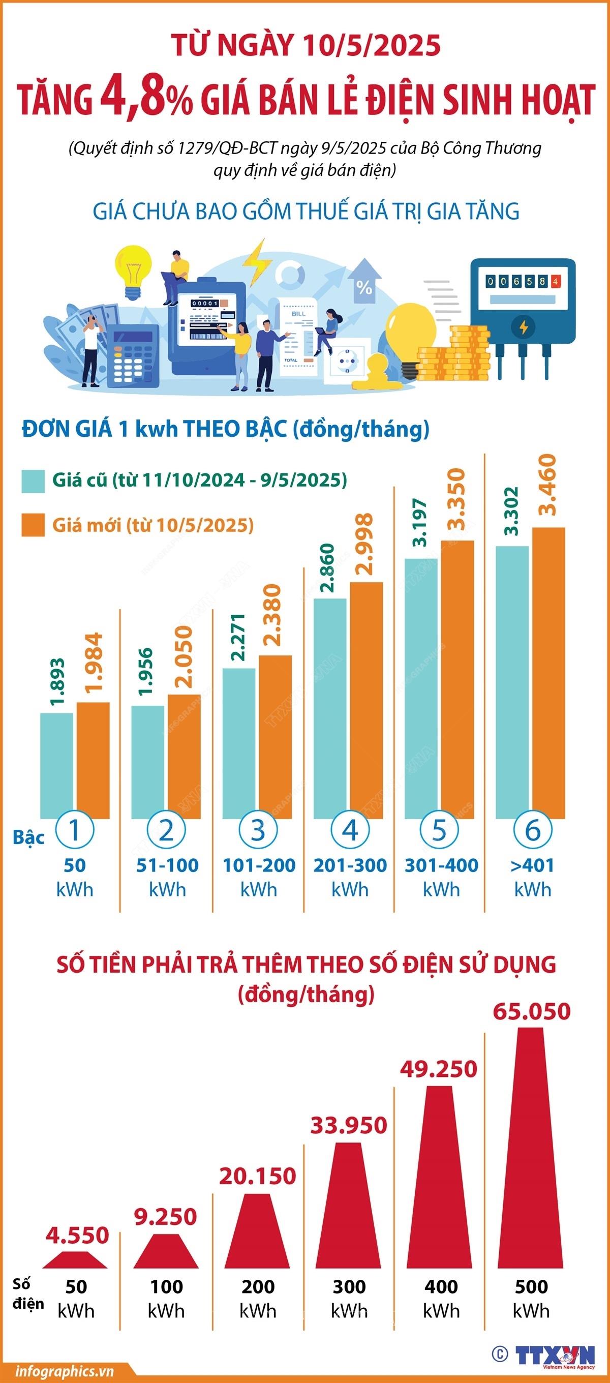 Hà Nội (TTXVN 9/5/2025) Từ 10/5/2025, giá bán lẻ điện bình quân tăng từ 2.103,11 đồng lên 2.204,0655 đồng một kWh (chưa gồm thuế VAT), tương đương tăng 4,8%. Mức tăng lần này được cân nhắc kỹ trên cơ sở biến động chi phí đầu vào (giá than, khí cho sản xuất điện) và chi phí tiền điện phải trả của người dân, doanh nghiệp. Theo tính toán của EVN, mỗi hộ gia đình sẽ phải trả thêm từ 4.350 đến 62.150 đồng/tháng nếu sử dụng từ 50 - 500 kWh/tháng.