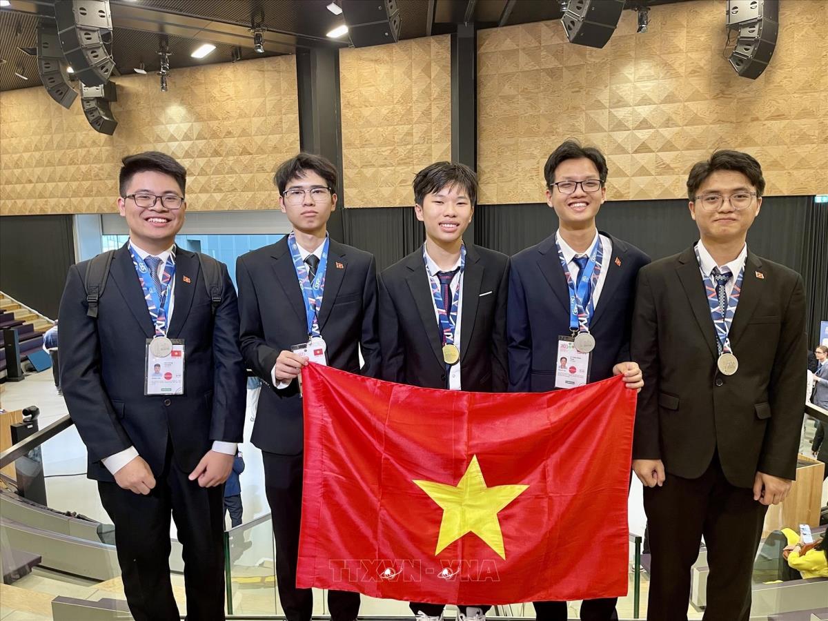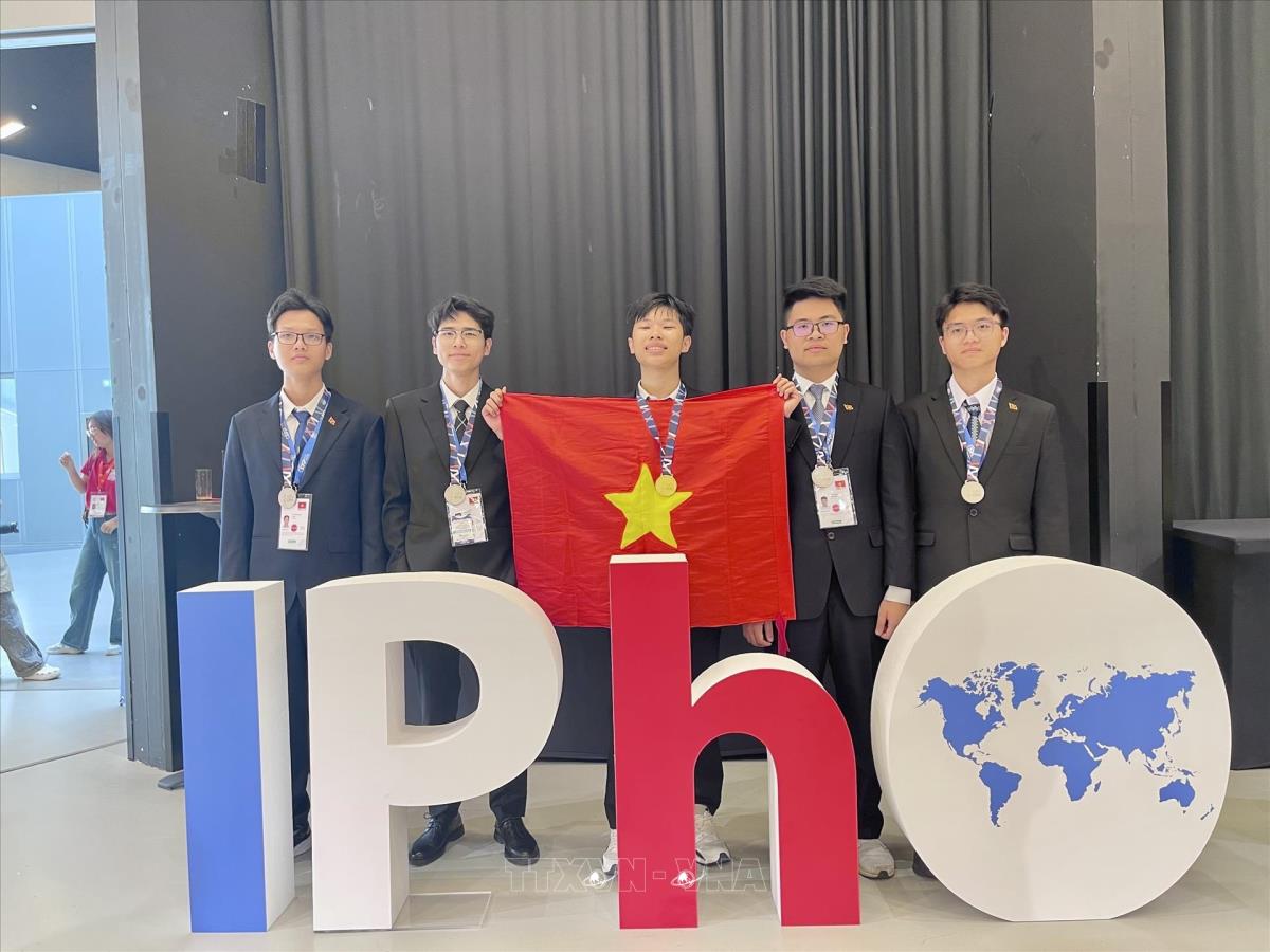 Năm thí sinh Việt Nam đều đoạt giải ở kỳ thi Olympic Vật lý Quốc tế 2025. Ảnh: Thu Hà - TTXVN tại Pháp