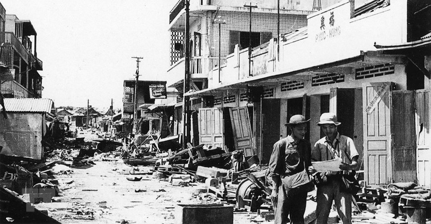Phóng viên Lam Thanh (bên trái) và Xuân Lâm trên đường phố Quảng Trị năm 1972. (Ảnh: Thông tấn xã Giải phóng)