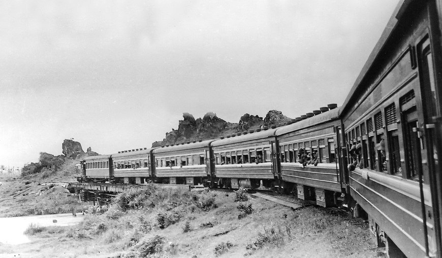 Đoàn tàu chở phóng viên lớp GP10 rời Hà Nội đi chiến trường miền Nam qua vùng Thanh Hóa còn đầy hố bom (tháng 3/1973). (Ảnh: Việt Nam thông tấn xã)