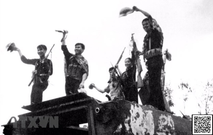 Phóng viên Thông tấn xã Giải phóng cùng các chiến sỹ quân giải phóng chuẩn bị tiến về Sài Gòn trong chiến dịch Hồ Chí Minh lịch sử, tháng 4/1975. (Ảnh: Việt Nam thông tấn xã)