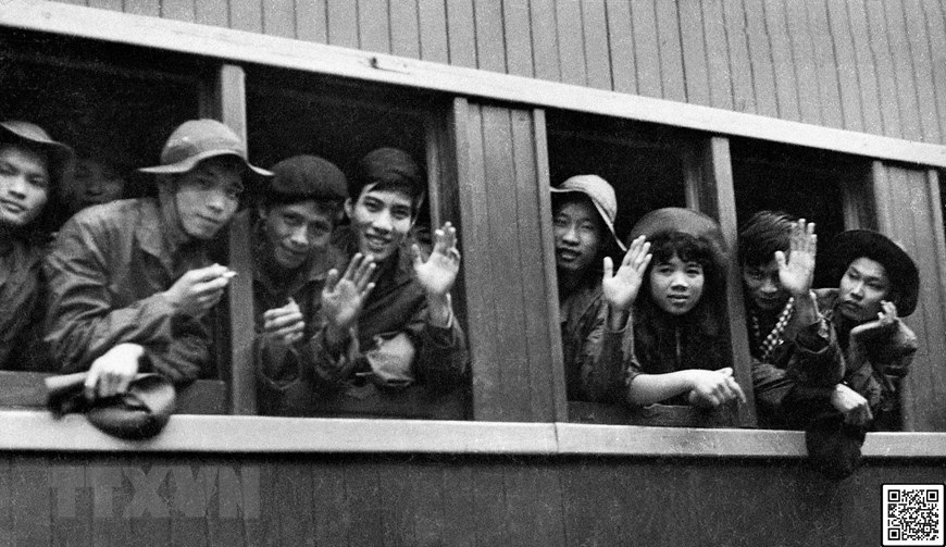 Tháng 3/1973, 150 phóng viên, điện báo viên, kỹ thuật viên Khóa GP10 của Việt Nam Thông tấn xã lên tàu vào chi viện cho Thông tấn xã Giải phóng tại chiến trường miền Nam. (Ảnh: Việt Nam thông tấn xã)