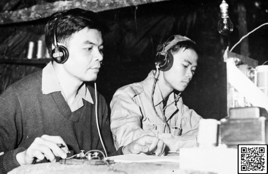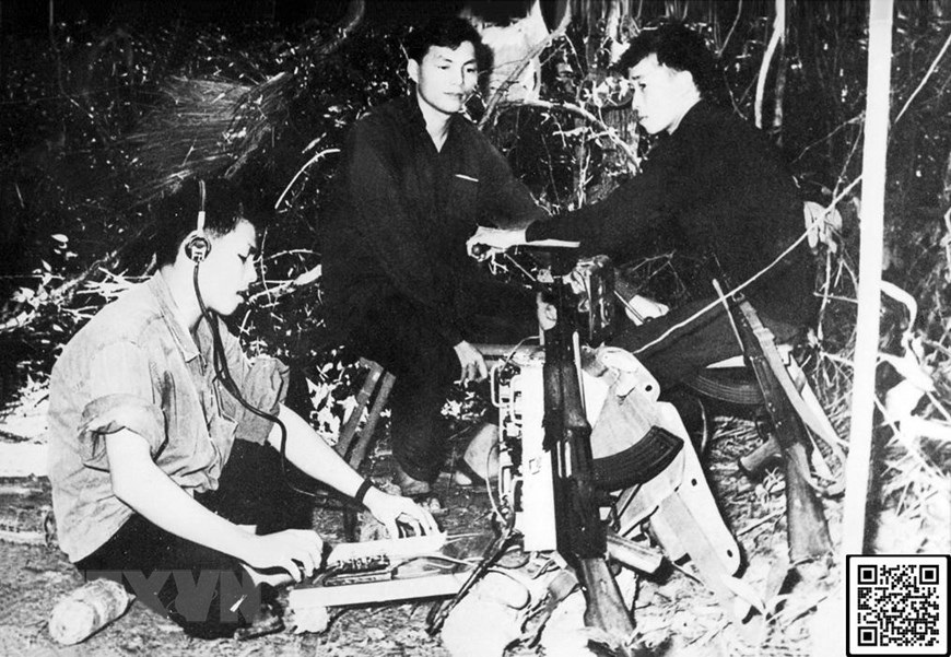 Tổ điện báo Thông tấn xã Giải phóng điện tin từ mặt trận về căn cứ. (Ảnh: Thông tấn xã Giải phóng)