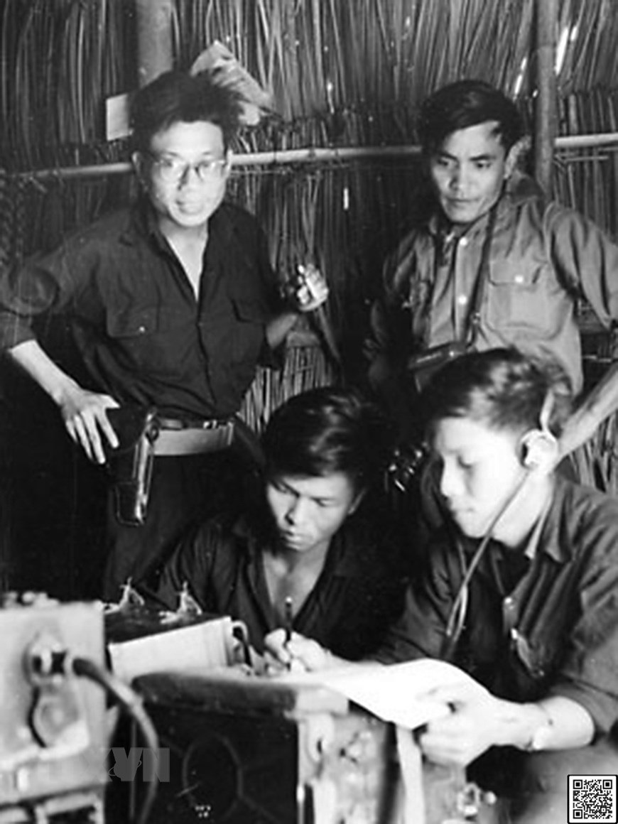 Nhà báo Lâm Tấn Tài (người đứng bìa phải) đang theo dõi truyền tin bài về cứ tại một tổ phóng viên Thông tấn xã Giải phóng tác nghiệp tại vùng ven Sài Gòn trươc cuộc Tổng tiến công và nổi dậy Xuân Mậu Thân 1968. (Ảnh: Thông tấn xã Giải phóng)