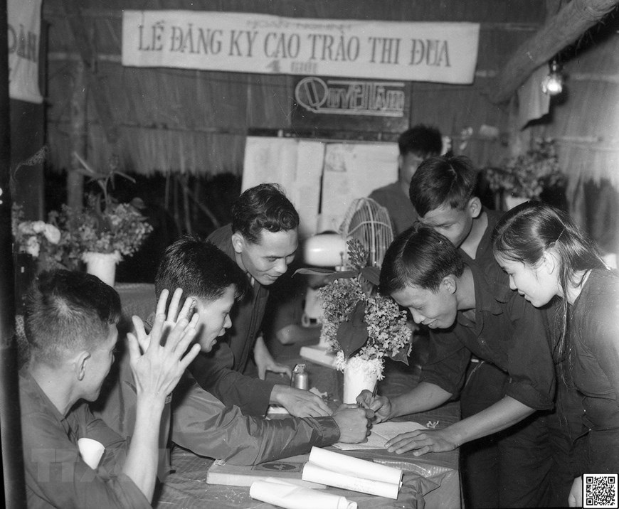 Đoàn Thanh niên Thông tấn xã Giải phóng tại căn cứ ký kết giao ước thi đua. (Ảnh: Thông tấn xã Giải phóng)