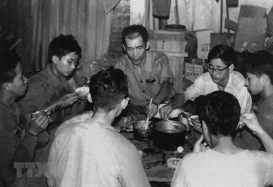 Phóng viên Việt Nam thông tấn xã trong một bữa cơm ở Thành cổ Quảng Trị (1972). (Ảnh: Việt Nam thông tấn xã)