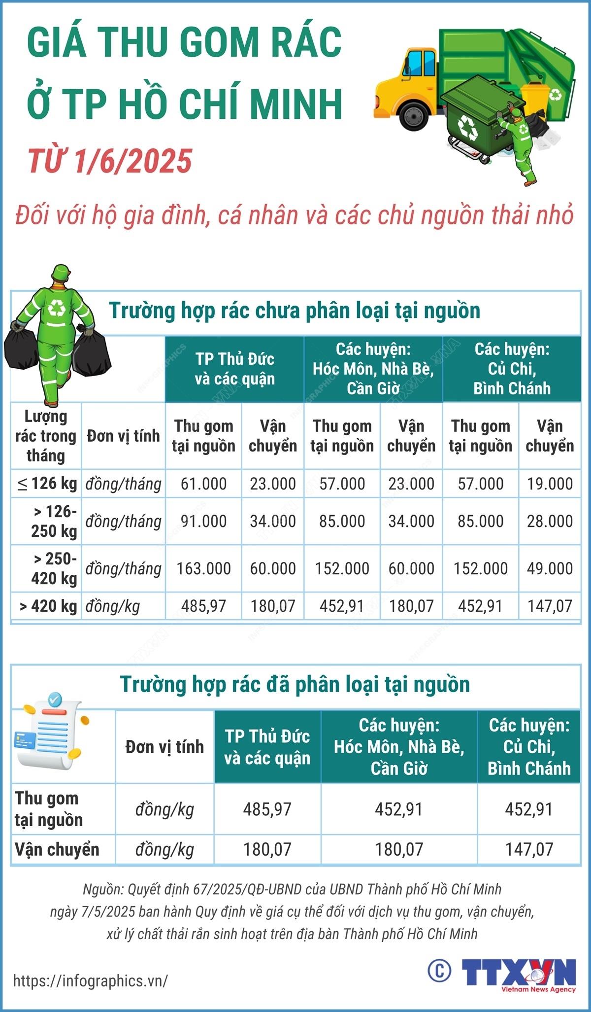 Hà Nội (TTXVN 31/5/2025) Từ ngày 1/6/2025, người dân TP HCM sẽ trả tiền thu gom rác theo khối lượng rác phát sinh. Mức giá cụ thể đối với dịch vụ thu gom, vận chuyển rác được ban hành theo Quyết định 67/2025/QĐ-UBND của UBND Thành phố.