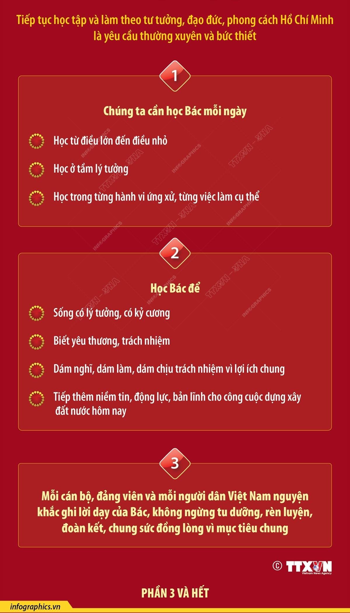 Việc tiếp tục học tập và làm theo tư tưởng, đạo đức, phong cách Hồ Chí Minh là yêu cầu thường xuyên và bức thiết. Chúng ta cần học Bác mỗi ngày - học từ điều lớn đến điều nhỏ, học ở tầm lý tưởng nhưng cũng học trong từng hành vi ứng xử, từng việc làm cụ thể.