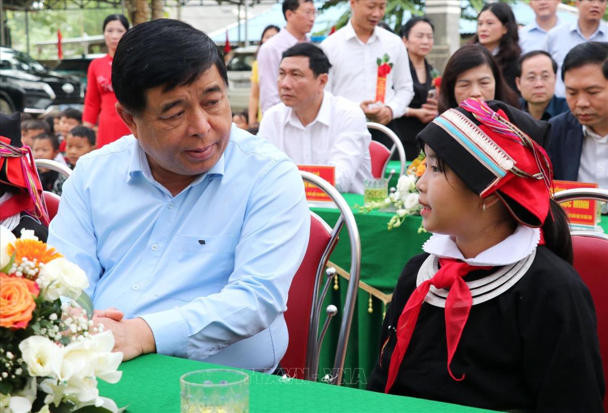 Phó Thủ tướng Nguyễn Chí Dũng động viên, chia sẻ với học sinh xã biên giới Minh Tân (Tuyên Quang) (9/11/2025). Ảnh Đức Thọ - TTXVN