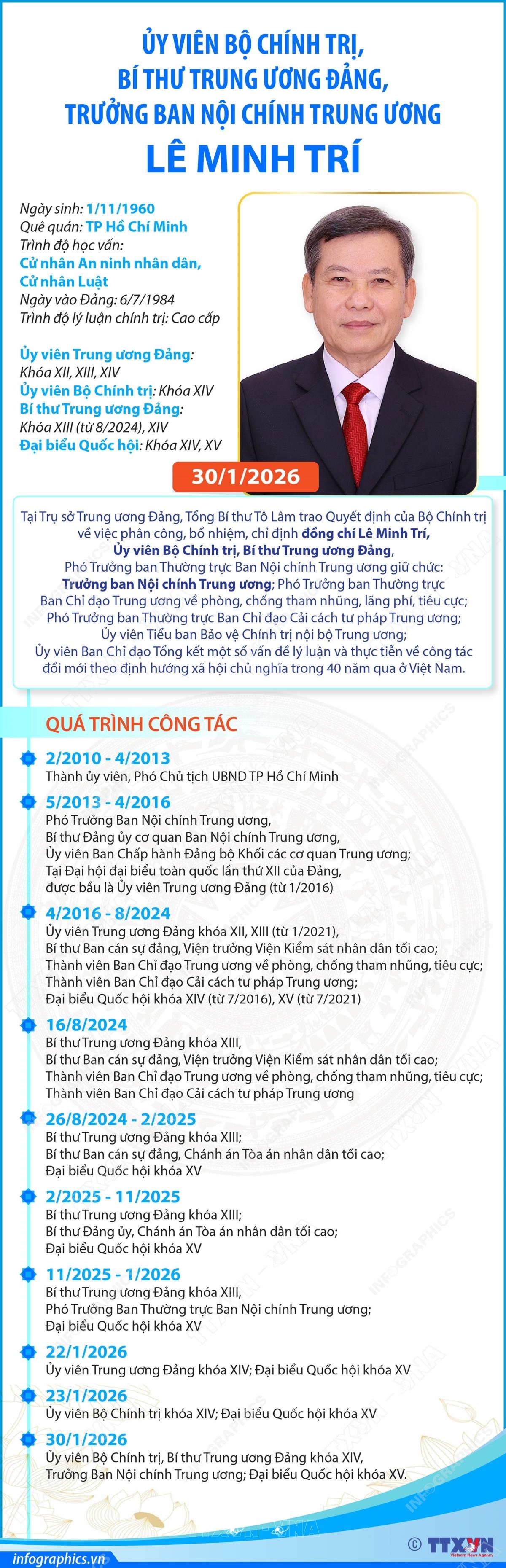 Hà Nội (TTXVN 30/1/2026) Ngày 30/1/2026, tại Trụ sở Trung ương Đảng, Tổng Bí thư Tô Lâm chủ trì lễ công bố và trao Quyết định của Bộ Chính trị về việc phân công, bổ nhiệm, chỉ định đồng chí Lê Minh Trí, Ủy viên Bộ Chính trị, Bí thư Trung ương Đảng, Phó Trưởng ban Thường trực Ban Nội chính Trung ương giữ chức: Trưởng ban Nội chính Trung ương; Phó Trưởng ban Thường trực Ban Chỉ đạo Trung ương về phòng, chống tham nhũng, lãng phí, tiêu cực; Phó Trưởng ban Thường trực Ban Chỉ đạo Cải cách tư pháp Trung ương; Ủy viên Tiểu ban Bảo vệ Chính trị nội bộ Trung ương; Ủy viên Ban Chỉ đạo Tổng kết một số vấn đề lý luận và thực tiễn về công tác đổi mới theo định hướng xã hội chủ nghĩa trong 40 năm qua ở Việt Nam.