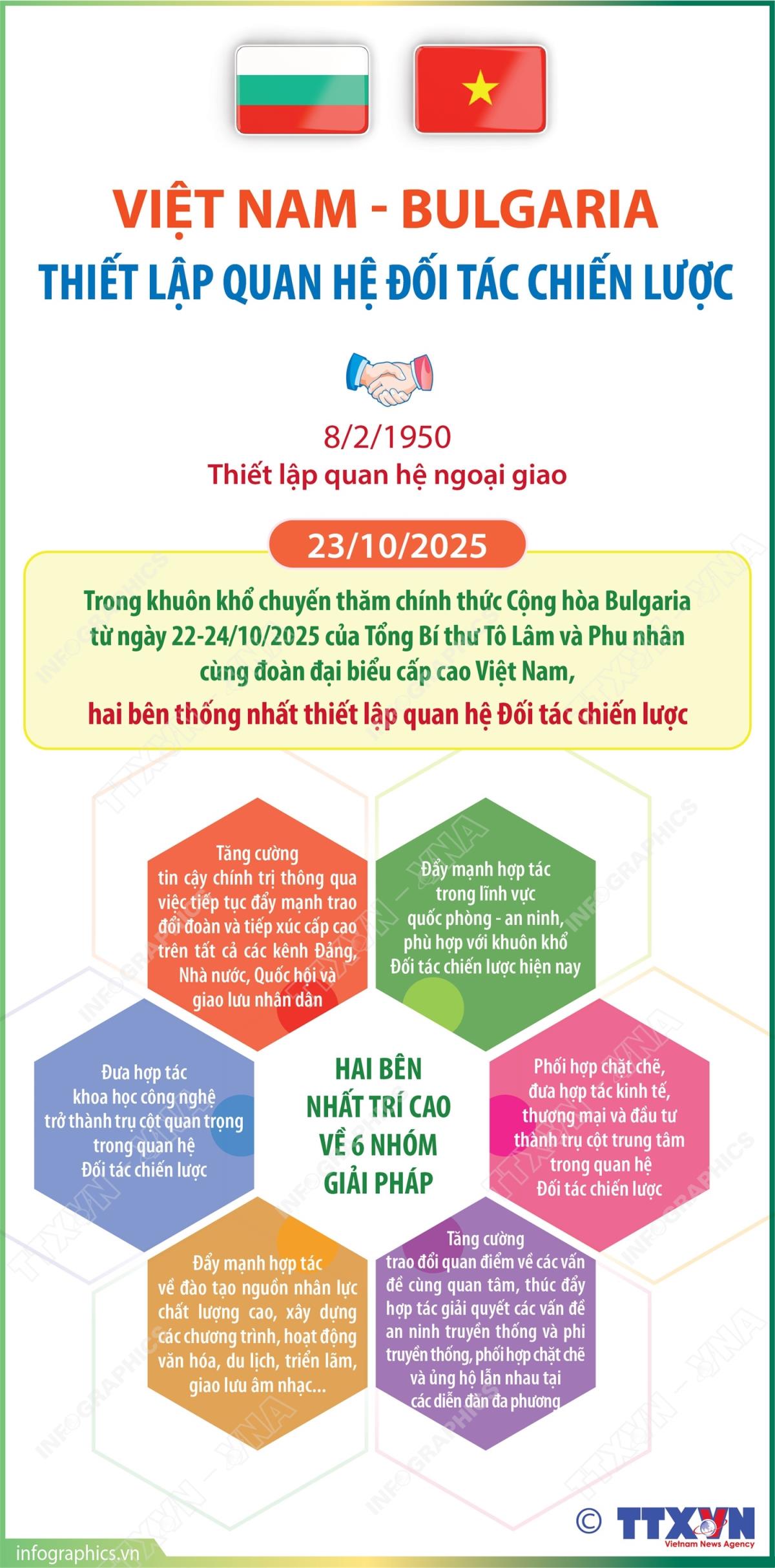 Hà Nội (TTXVN 24/10/2025) Trong khuôn khổ chuyến thăm chính thức Cộng hòa Bulgaria từ ngày 22-24/10/2025 của Tổng Bí thư Tô Lâm và Phu nhân cùng đoàn đại biểu cấp cao Việt Nam, hai bên đã thống nhất thiết lập quan hệ Đối tác chiến lược.