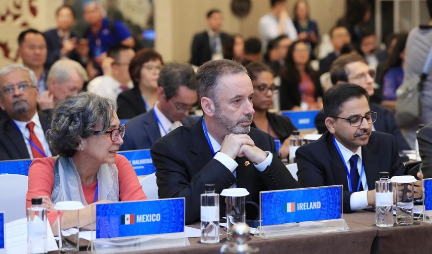 Trong ảnh: Điều phối viên thường trú của Liên Hợp Quốc Kamal Malhotra (thứ 2 từ trái sang) và các đại biểu quốc tế dự Phiên họp đầu cầu Hà Nội. (Ảnh: Lâm Khánh/TTXVN)