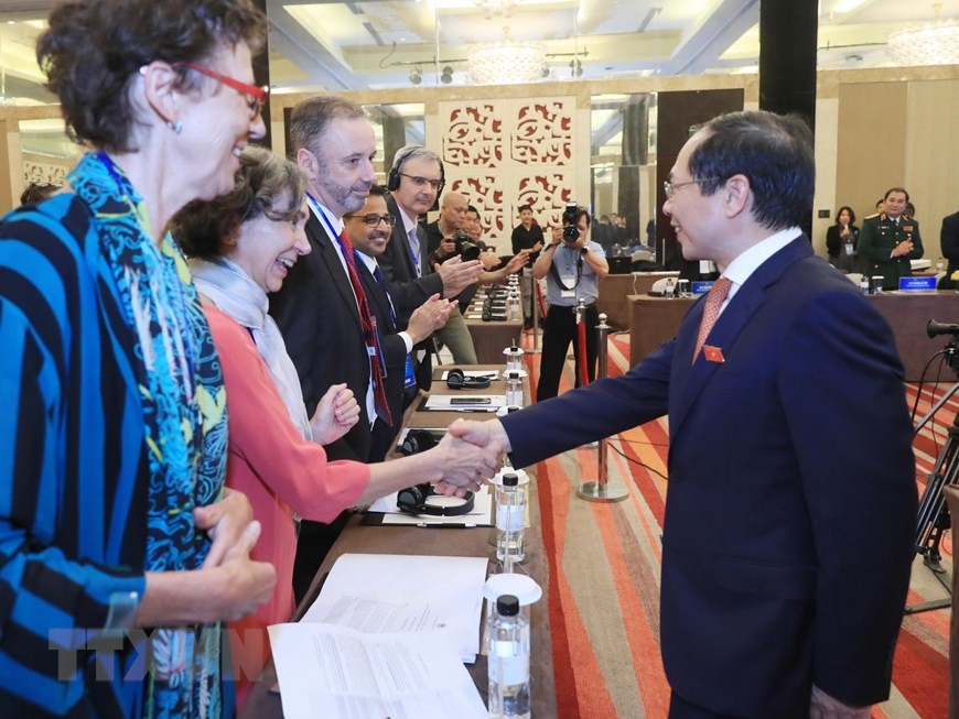 Bộ trưởng Bộ Ngoại giao Bùi Thanh Sơn với các đại biểu Việt Nam dự phiên họp. (Ảnh: Lâm Khánh/TTXVN)