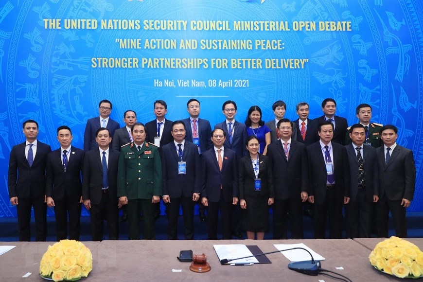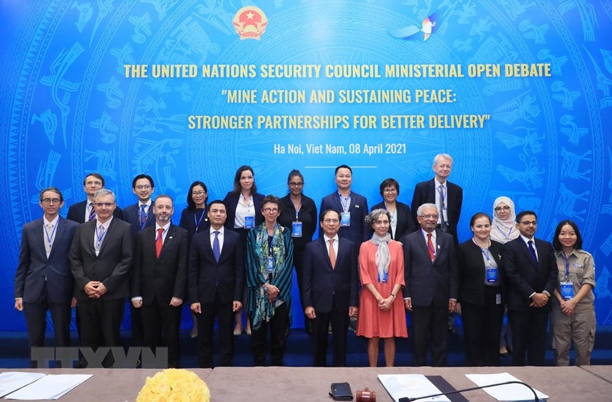 Hà Nội (TTXVN 8/4/2021) Tối 8/4/2021, Việt Nam tổ chức Phiên họp cấp bộ trưởng về chủ đề "Khắc phục hậu quả bom, mìn và duy trì hòa bình bền vững: Tăng cường gắn kết để hiệu quả hơn," với sự chủ trì của Bộ trưởng Ngoại giao.