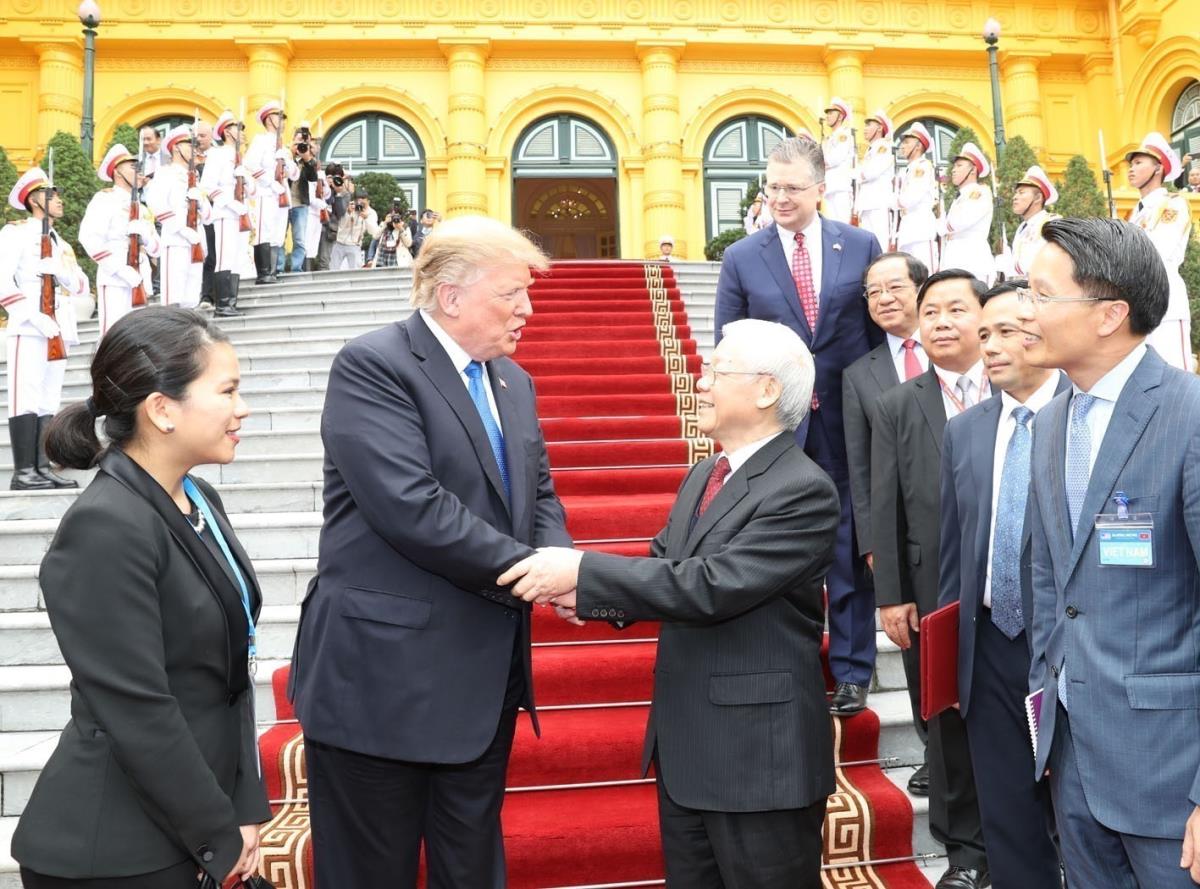 Tổng Bí thư, Chủ tịch nước Nguyễn Phú Trọng tiếp Tổng thống Hoa Kỳ Donald Trump nhân dịp sang Việt Nam dự Hội nghị thượng đỉnh Mỹ - Triều Tiên lần thứ hai (Hà Nội, 27/2/2019). Ảnh: Trí Dũng - TTXVN