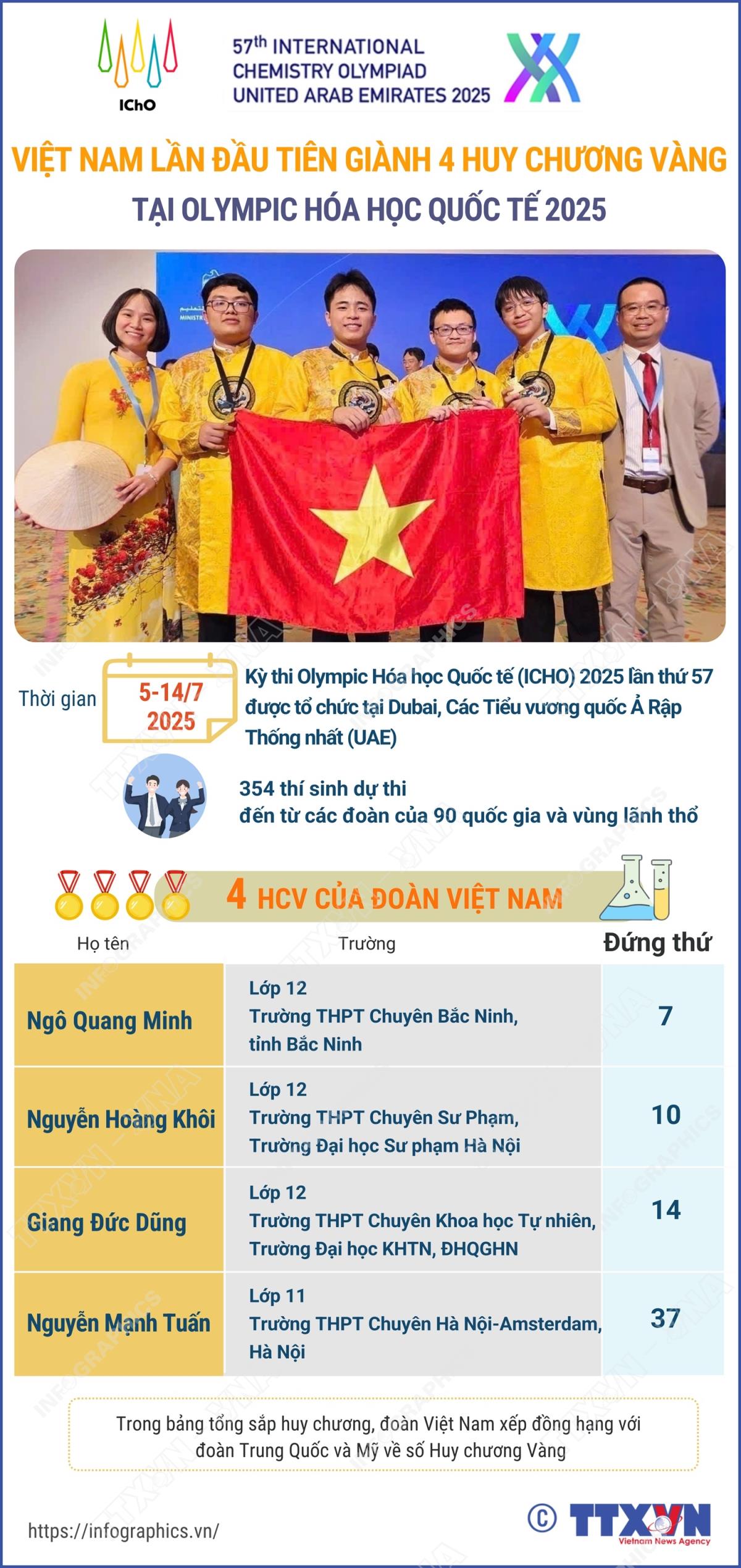Hà Nội (TTXVN 14/7/2025) Đội tuyển Việt Nam đã xuất sắc giành 4 Huy chương Vàng, trong đó có 2 Huy chương Vàng nằm trong top 10 tại Kỳ thi Olympic Hóa học Quốc tế (ICHO) 2025. Đây cũng là lần đầu tiên trong lịch sử, Việt Nam giành 4 Huy chương Vàng trong một Kỳ thi ICHO được tổ chức trực tiếp.