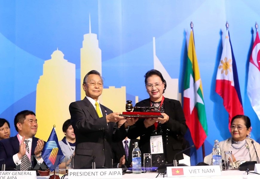 Chủ tịch Quốc hội Nguyễn Thị Kim Ngân tiếp nhận chức Chủ tịch Đại hội đồng Liên nghị viện ASEAN lần thứ 41 (AIPA 41), tại lễ bế mạc Đại hội đồng AIPA 40 ở Bangkok (THái Lan), sáng 29/8/2019. (Ảnh: Trọng Đức/TTXVN)