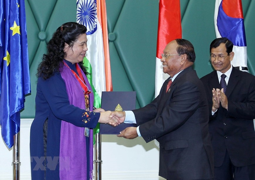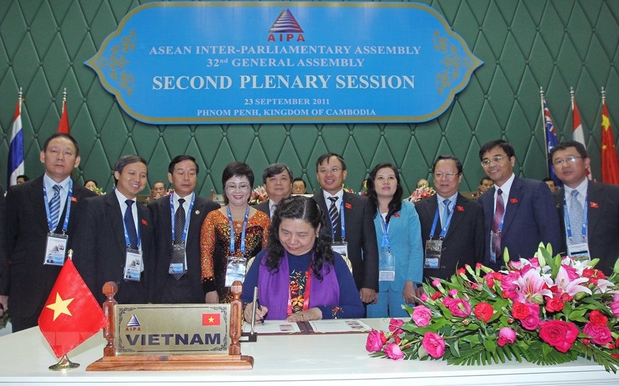 Phó Chủ tịch Quốc hội Tòng Thị Phóng, Trưởng đoàn Quốc hội Việt Nam tham dự AIPA-32 ký Tuyên bố chung của Hội nghị, ngày 23/9/2011, tại Phnom Penh (Campuchia). (Ảnh: Nhan Sáng/TTXVN)