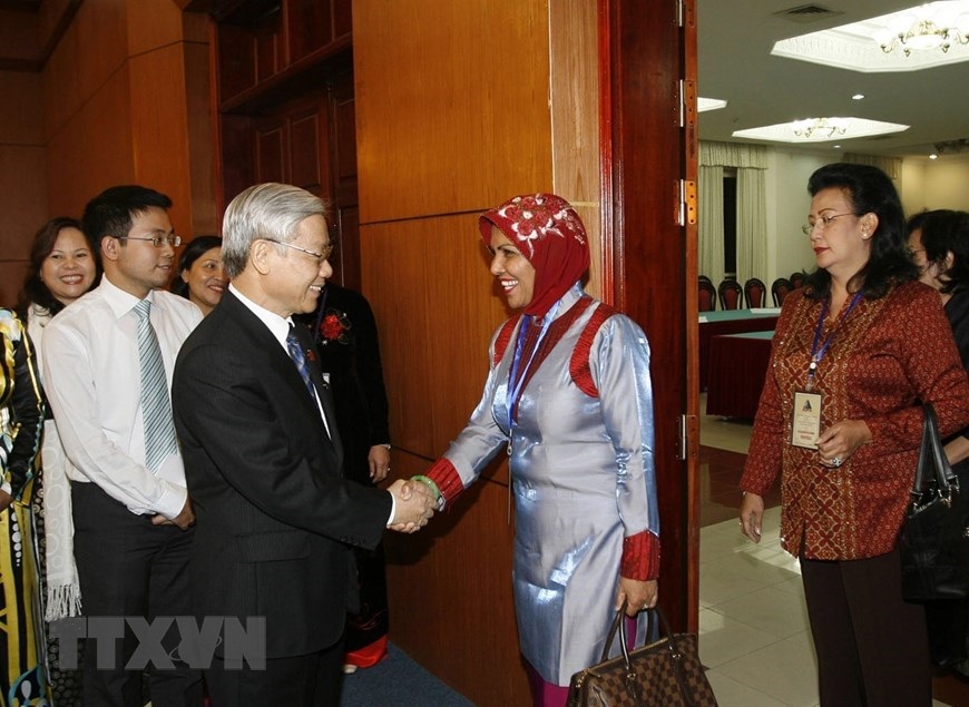 Chủ tịch Quốc hội, Chủ tịch AIPA 31 Nguyễn Phú Trọng tiếp đại biểu dự Hội nghị chuyên đề của AIPA về 'Vai trò của các nữ nghị sĩ trong quá trình xây dựng pháp luật ' diễn ra tại Hà Nội, ngày 30/11/2009. (Ảnh: Trí Dũng/TTXVN)