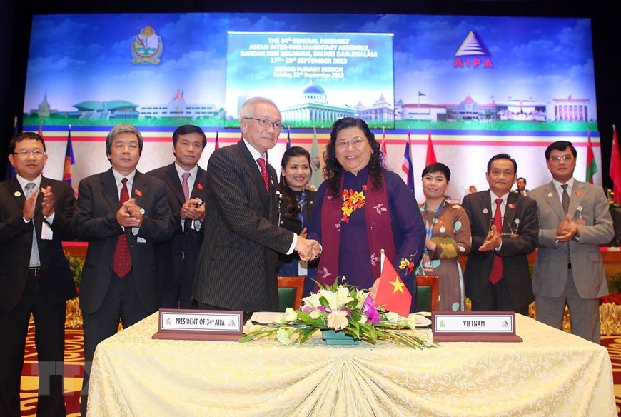 Phó Chủ tịch Quốc hội Tòng Thị Phóng, Trưởng đoàn Việt Nam và ông Pehin Dato Isa bin Ibrahim, Chủ tịch Hội đồng Lập pháp, Trưởng đoàn Brunei ký Thông cáo chung của AIPA tại phiên bế mạc Đại hội đồng AIPA lần thứ 34 (Brunei, 22/9/2013). (Ảnh: Trọng Đức/TTXVN)