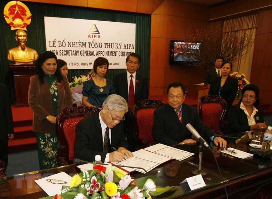 Chủ tịch Quốc hội Nguyễn Phú Trọng, Chủ tịch AIPA 31, Trưởng Ban Chỉ đạo Quốc gia Đại hội đồng AIPA-31 ký chứng nhận bổ nhiệm ông Antonio V. Cuenco, nguyên Chủ nhiệm Uỷ ban Đối ngoại Hạ viện Phlippines làm Tổng thư ký chuyên trách thứ hai của AIPA, ngày 5/2/2010, tại Hà Nội. (Ảnh: Trí Dũng/TTXVN)
