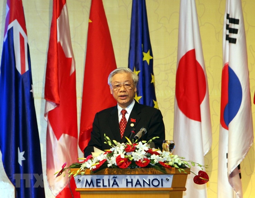 Chủ tịch Quốc hội Việt Nam, Chủ tịch Đại hội đồng AIPA-31 Nguyễn Phú Trọng, Thủ tướng Nguyễn Tấn Dũng chụp ảnh chung với Trưởng đoàn Nghị viện các nước thành viên AIPA dự lễ khai mạc Đại hội đồng AIPA lần thứ 31, ngày 21/9/2019, ở Hà Nội. (Ảnh: Trí Dũng/TTXVN)
