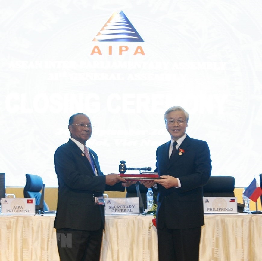 Chủ tịch Quốc hội, Chủ tịch AIPA-31 Nguyễn Phú Trọng bàn giao chức Chủ tịch AIPA 32 cho Chủ tịch Quốc hội Campuchia Heng Samrin, tại lễ bế mạc Đại hội đồng AIPA lần thứ 31, ngày 24/9/2010, tại Hà Nội. (Ảnh: Trí Dũng/TTXVN)