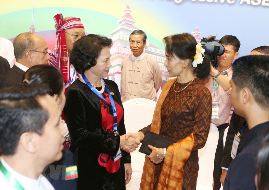 Chủ tịch Quốc hội Nguyễn Thị Kim Ngân và Cố vấn Nhà nước Myanmar Aung San Suu Kyi tại Lễ khai mạc Đại hội đồng AIPA -37, tại Nay Pyi Taw (Myanmar), sáng 30/9/2016. (Ảnh: Trọng Đức/TTXVN)