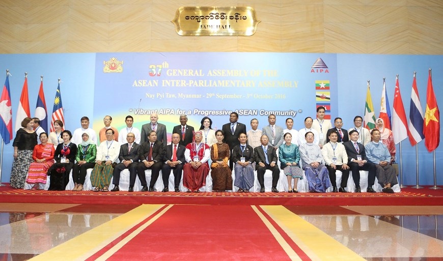 Chủ tịch Quốc hội Nguyễn Thị Kim Ngân chụp ảnh chung cùng đại biểu các đoàn tại Lễ khai mạc Đại hội đồng AIPA-37 ở Nay Pyi Taw (Myanmar), sáng 30/9/2016. (Ảnh: Trọng Đức/TTXVN)