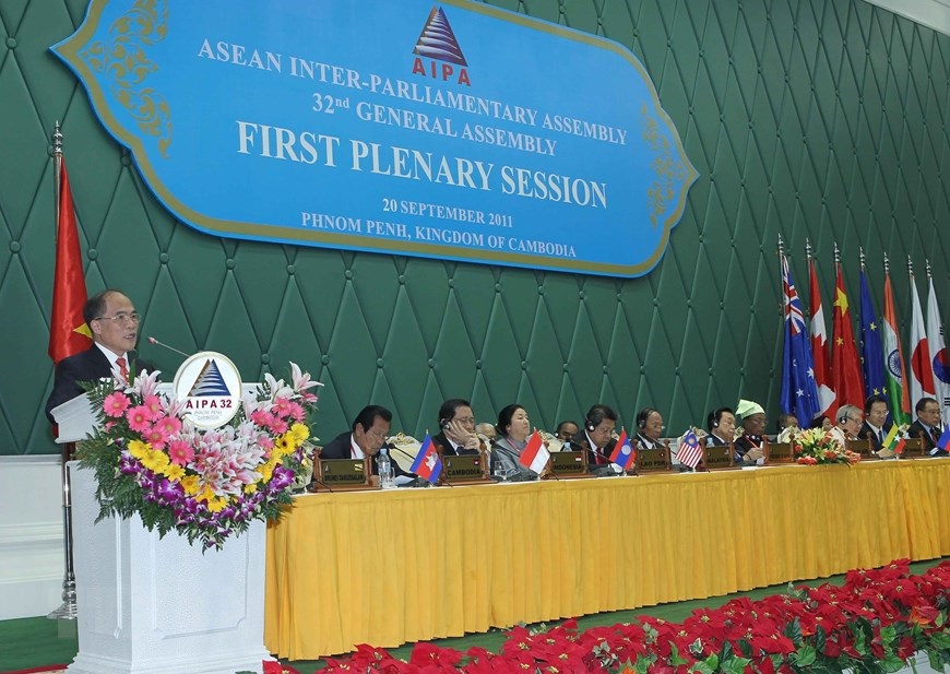 Chủ tịch Quốc hội Nguyễn Sinh Hùng dự Phiên họp thứ nhất của Đại hội đồng AIPA lần thứ 32, ngày 20/9/2011, tại Phnom Penh (Campuchia). (Ảnh: Nhan Sáng/TTXVN)