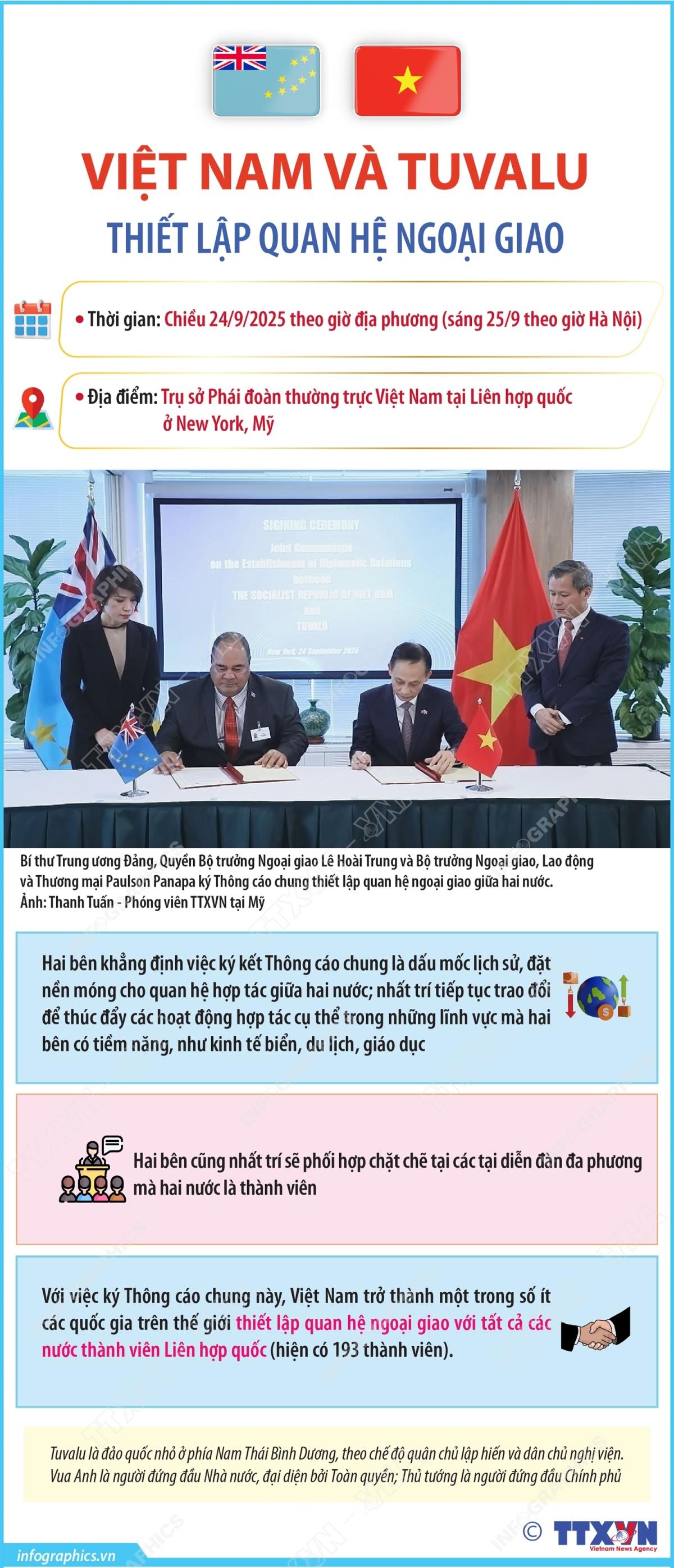 Chiều 24/9/2025 theo giờ địa phương (sáng 25/9 theo giờ Hà Nội), tại trụ sở Phái đoàn thường trực Việt Nam tại Liên hợp quốc (LHQ) ở New York, Bí thư Trung ương Đảng, Quyền Bộ trưởng Ngoại giao Lê Hoài Trung và Bộ trưởng Ngoại giao, Lao động và Thương mại Tuvalu Paulson Panapa đã ký Thông cáo chung thiết lập quan hệ ngoại giao giữa Cộng hòa xã hội chủ nghĩa Việt Nam và Tuvalu. Theo phóng viên TTXVN tại New York, với việc ký Thông cáo chung này, Việt Nam trở thành một trong số ít các quốc gia trên thế giới thiết lập quan hệ ngoại giao với tất cả các nước thành viên LHQ (hiện có 193 thành viên).