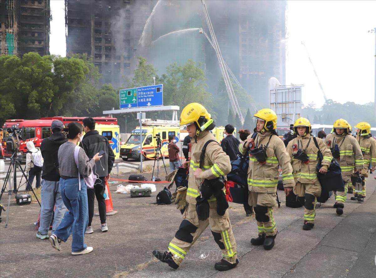 Các nhân viên cứu hộ tại hiện trường vụ cháy (27/11/2025). Ảnh: Xuân Vịnh - PV TTXVN tại Hong Kong (Trung Quốc)