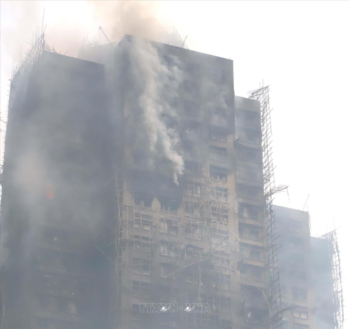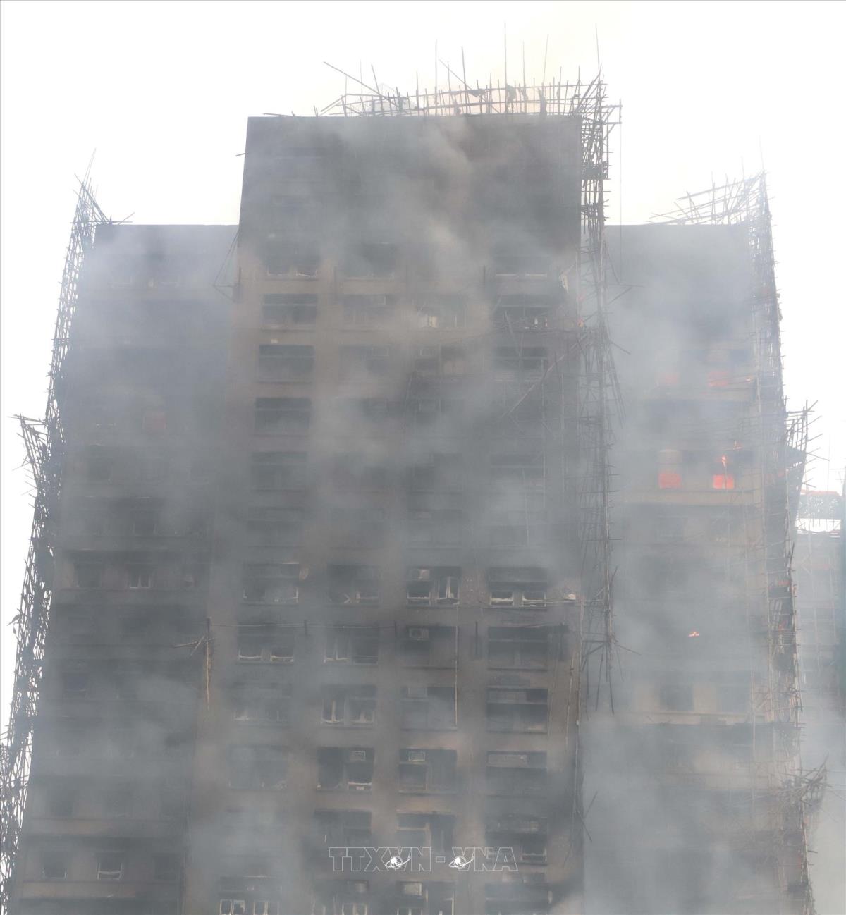 Lửa vẫn cháy âm ỉ trong một số căn hộ ở tầng cao (27/11/2025). Ảnh: Xuân Vịnh - PV TTXVN tại Hong Kong (Trung Quốc)