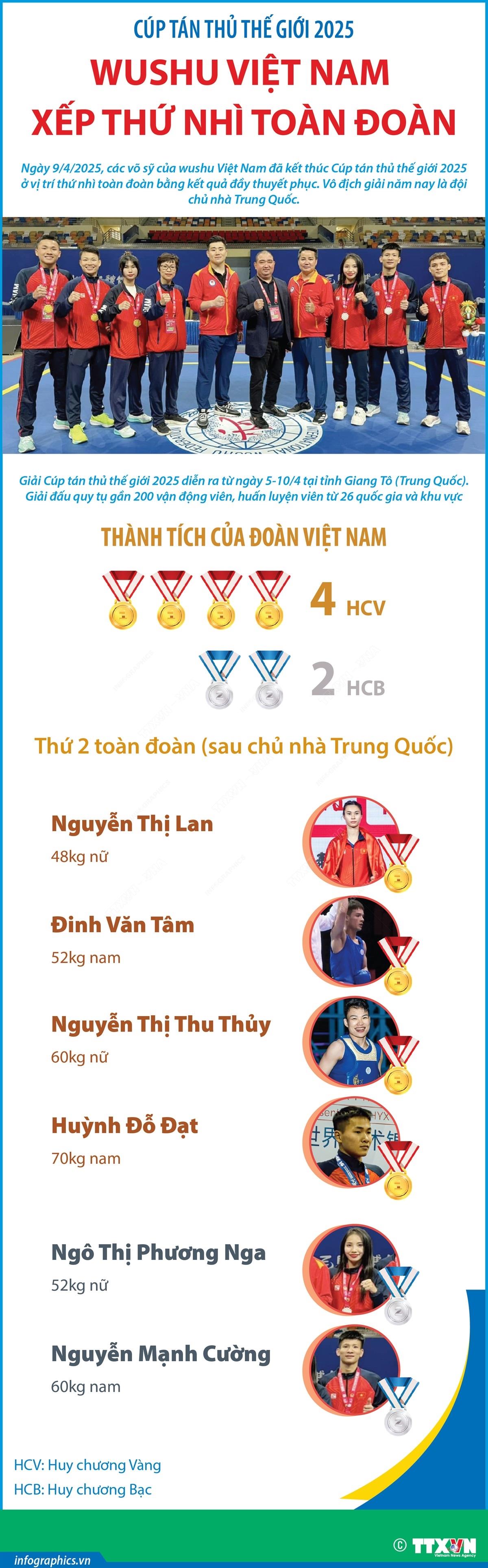 Hà Nội (TTXVN 10/4/2025) Ngày 9/4/2025, các võ sỹ của wushu Việt Nam đã kết thúc Cúp tán thủ thế giới 2025 ở vị trí thứ nhì toàn đoàn bằng kết quả đầy thuyết phục. Vô địch giải năm nay là đội chủ nhà Trung Quốc. Giải Cúp tán thủ thế giới 2025 diễn ra từ ngày 5-10/4 tại tỉnh Giang Tô (Trung Quốc), quy tụ gần 200 vận động viên điền kinh, huấn luyện viên từ 26 quốc gia và khu vực.