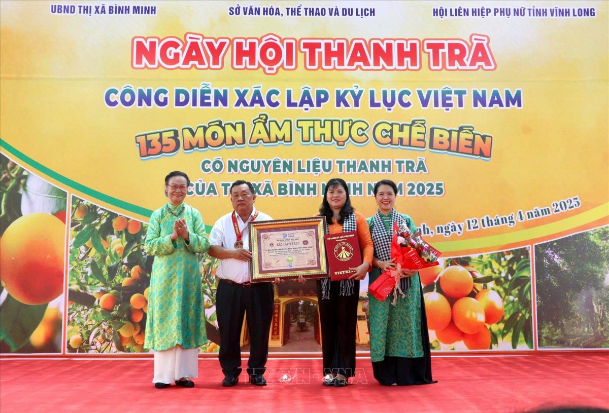 Vĩnh Long (TTXVN 12/4) Ngày 12/4, Sở Văn hóa Thể thao và Du lịch tỉnh Vĩnh Long phối hợp Hội Liên hiệp Phụ nữ tỉnh và UBND thị xã Bình Minh tổ chức Ngày hội Thanh trà và công diễn xác lập Kỷ lục Việt Nam 135 món ăn chế biến có nguyên liệu từ trái thanh trà của thị xã Bình Minh.
